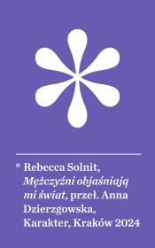 To jednak zaledwie czubek góry lodowej – autorka opowiada o innych zdarzeniach (często obficie relacjonowanych przez media), w których ujawnia się symboliczna lub nawet fizyczna przemoc wobec kobiet (w Stanach Zjednoczonych co 6 minut zgłaszany jest gwałt, a są to bardzo zaniżone statystyki). Jednocześnie Solnit wpisuje sytuację i prawa kobiet w szerszy geopolityczny i kulturowy kontekst. Przywołuje też dwie inne wybitne eseistki: Virginię Woolf i Susan Sontag, z którymi podejmuje dialog i polemizuje. Lekki styl i bystrość wywodu sprawiają, że od tekstów Solnit trudno się oderwać. Z pewnością powinny one dać do myślenia zarówno kobietom, jak i mężczyznom – są aktualne aż do bólu.