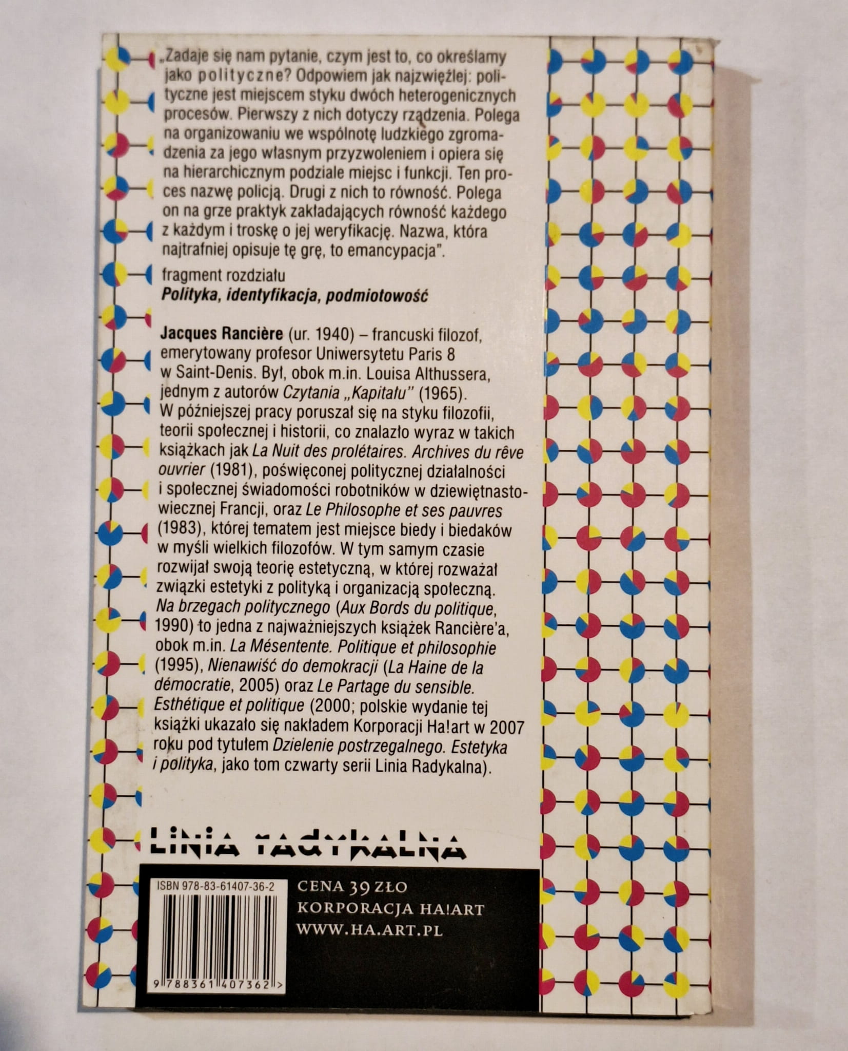 "Zadaje się nam pytanie, czym jest to, co określamy jako polityczne? Odpowiem jak najzwięźlej: polityczne jest miejscem styku dwóch heterogenicznych procesów. Pierwszy z nich dotyczy rządzenia. Polega na organizowaniu we wspólnotę ludzkiego zgromadzenia za jego własnym przyzwoleniem i opiera się na hierarchicznym podziale miejsc i funkcji. Ten proces nazwę policją. Drugi z nich to równość. Polega on na grze praktyk zakładających równość każdego z każdym i troskę o jej weryfikację. Nazwa, która najtrafniej opisuje tę grę, to emancypacja".